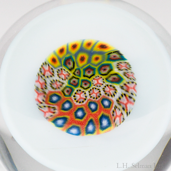 David Graeber and Jordan "J" Fell (2023) collaborative bee and murrina marble. A pollen laden bee, with translucent wings spreading from a fuzzy head, hovers above a mottled gray ground, with a orange, blue, green and yellow complex murrina cane on the underside. Diameter 1 5/8".